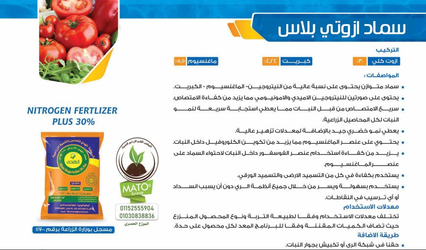 سماد متوازن يحتوي علي نسبة عالية من النيتروجين – الماغنيسيوم – الكبريت .