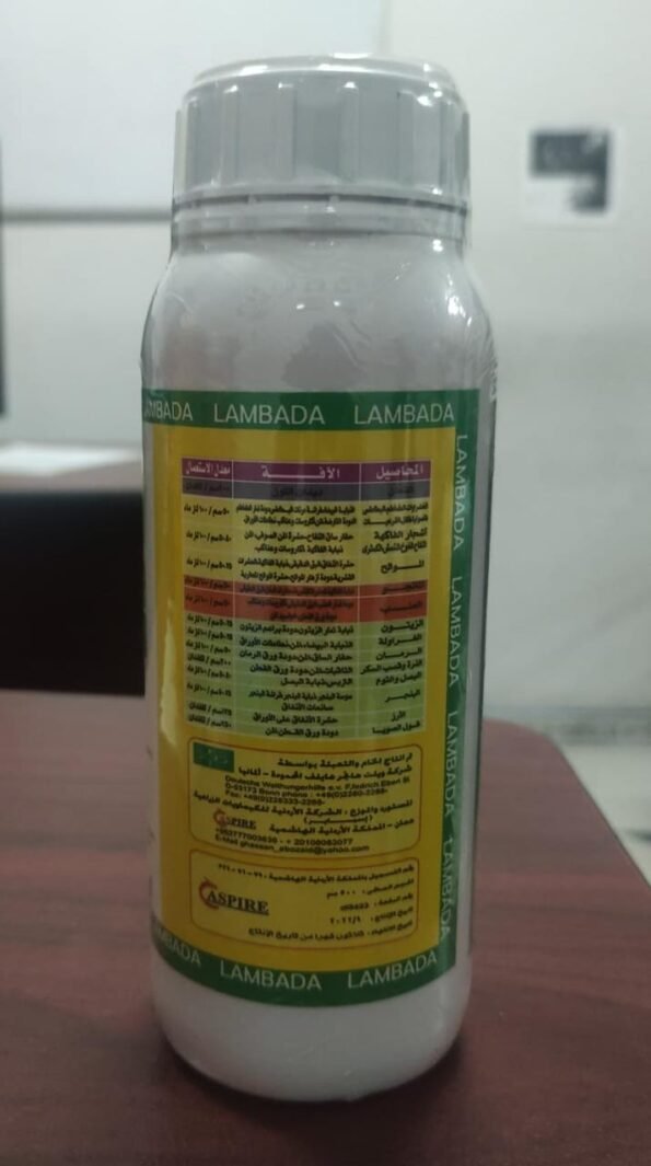 خواص إستعمال مبيد لمبادا :- مبيد حشري من مجموعة البيرثرويد 3A Pyrethroids – يحتوي على مادة فعاله لمبادا سيهالوثرين lambda-cyhalothrin بتركيز 10% ، قليل السمية للإنسان والحيوان ويقاوم غالبية الحشرات والآفات.